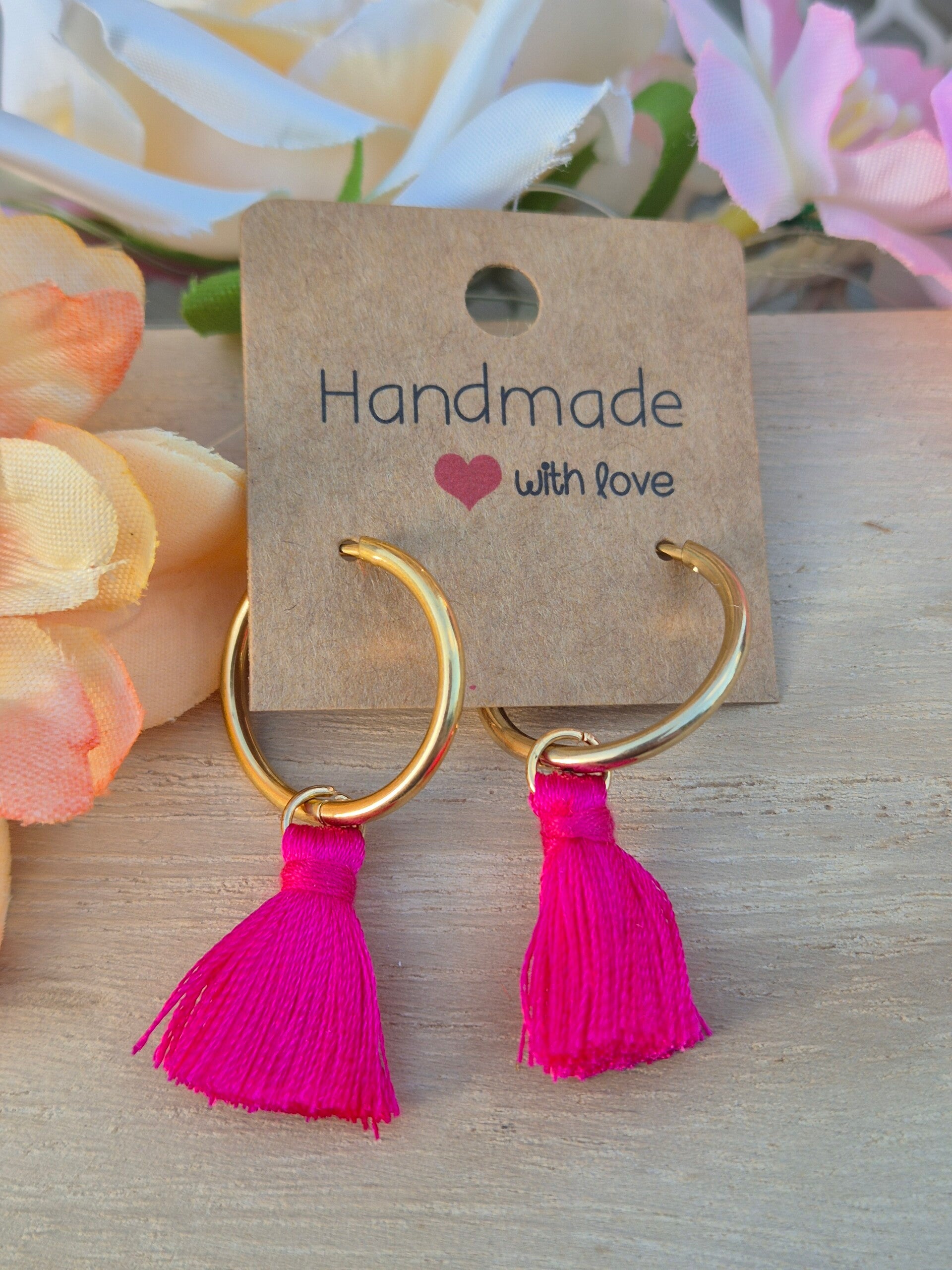 Créoles à pampilles interchangeables pompons roses vifs