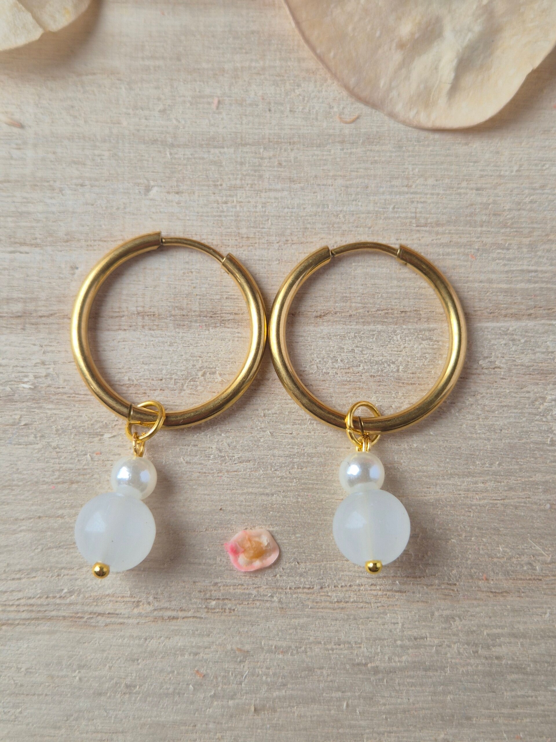 - 🩵1 paire perles blanches et perle nacrée confectionnée à l’atelier (modèle unique)